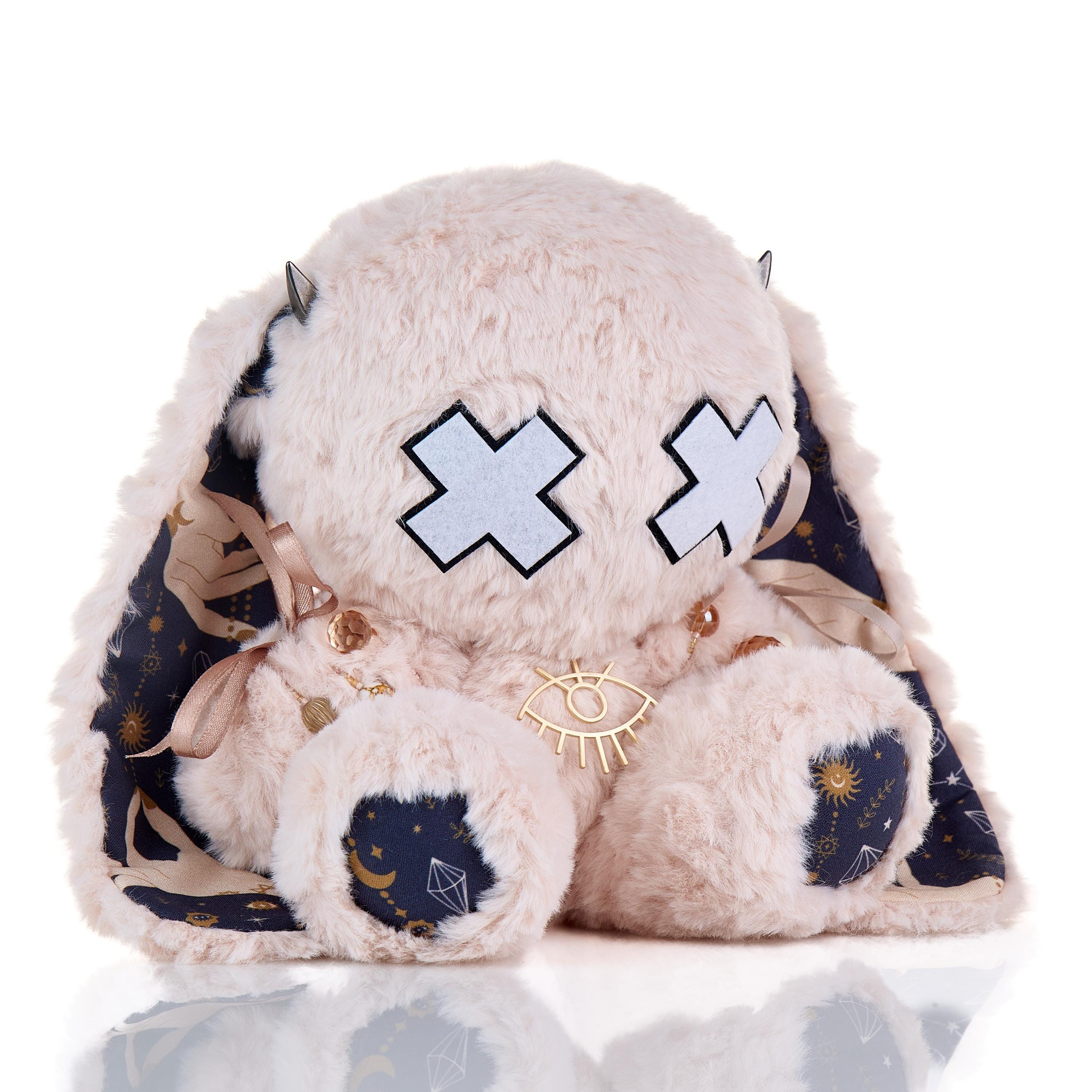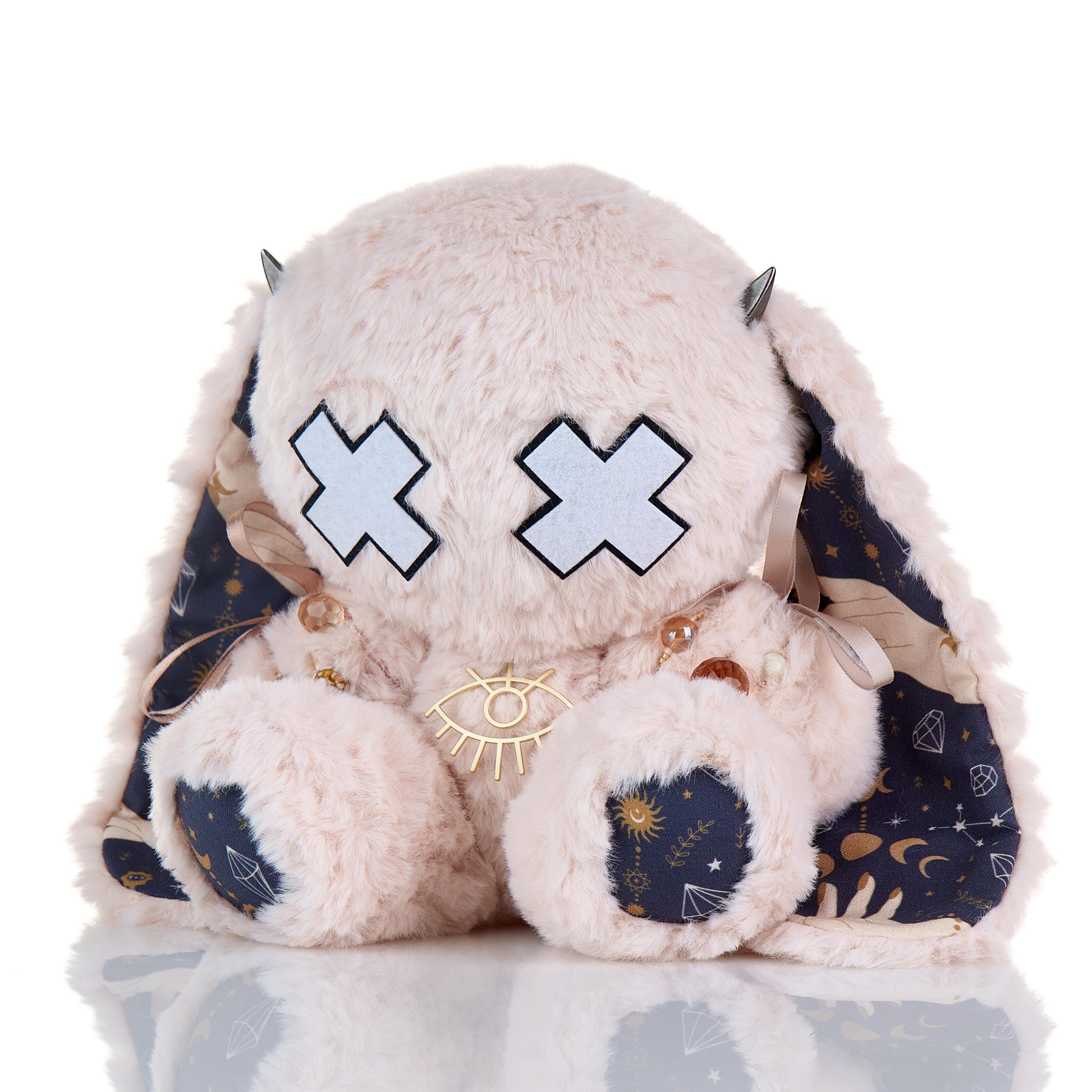 (haunted) Arcane Bunny was actually born in March 2024 but for some mysterious reason was misplaced, and never actually put on the store platform until now - April 2026. This is something that almost never happened in 17+ years of me making my plushies. Which always makes me think that the true owner of this bunny was unavailable at the time and the plushie clocked itself, hidden in plain sight, waiting for the right time to be found.